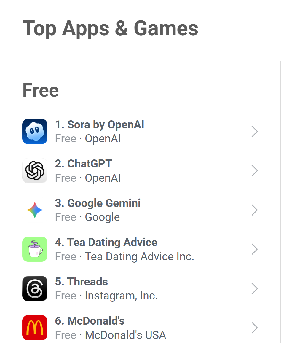 从用户增加趋向看,上线万次安拆,其排名已攀升至该榜单第1位。OpenAI旗下视频生成使用Sora自2025年9月30日上线以来,